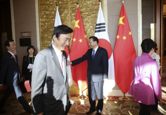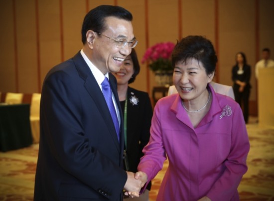韓國總統(tǒng)樸槿惠對李克強總理表示:"韓中日三國合作有利于地區(qū)和平穩(wěn)定。要引導(dǎo)日本抱著正確的歷史觀,為東北亞和平做出貢獻(xiàn)。"